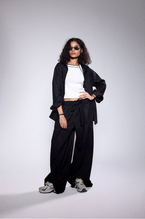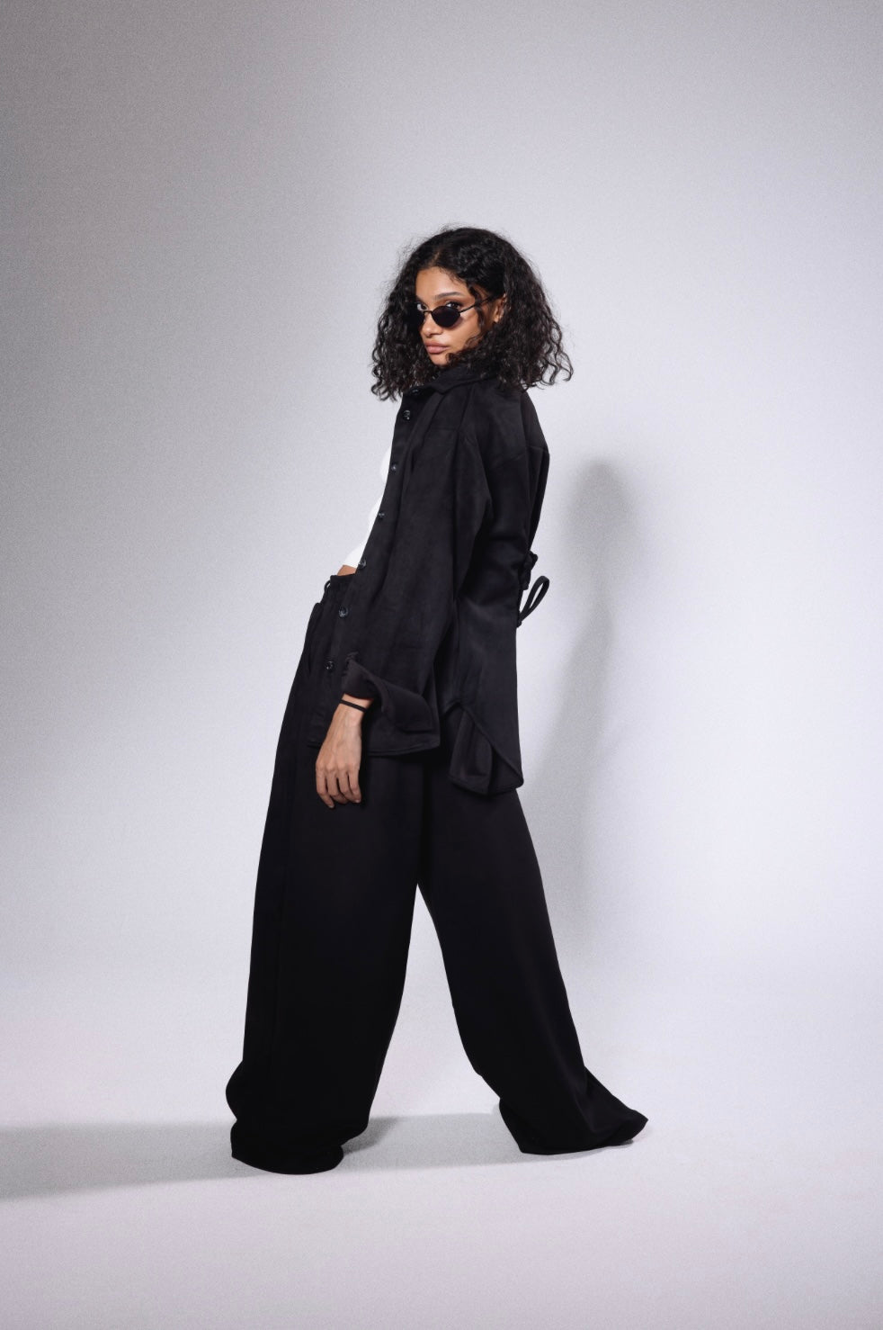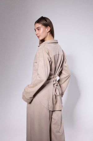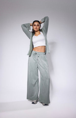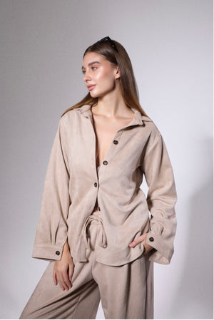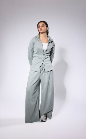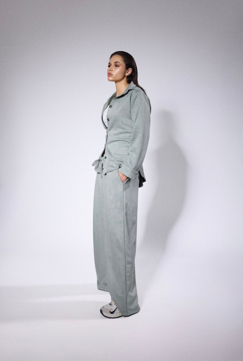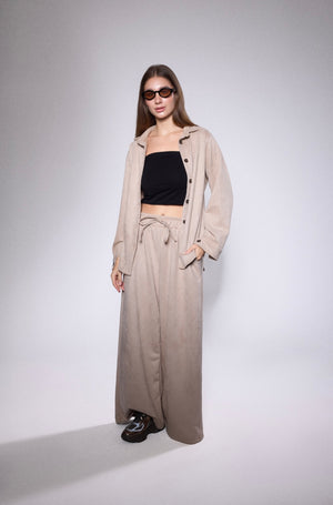 The set includes a button-down suede shirt and wide-leg pants designed for a relaxed yet elevated look.