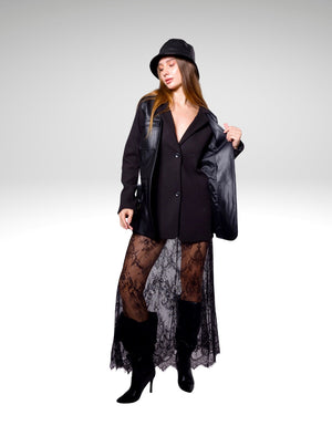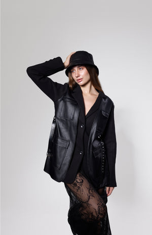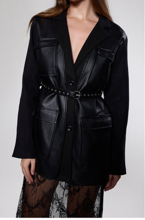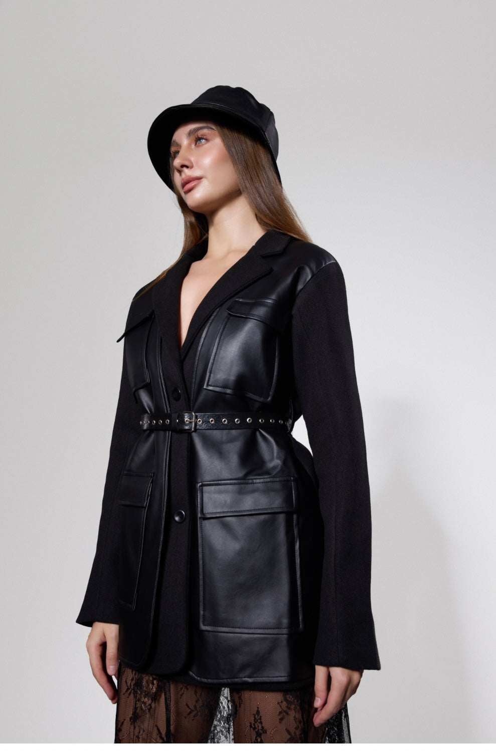 A statement double-layer jacket with belt crafted from premium faux leather and cozy wool-blend fabric.