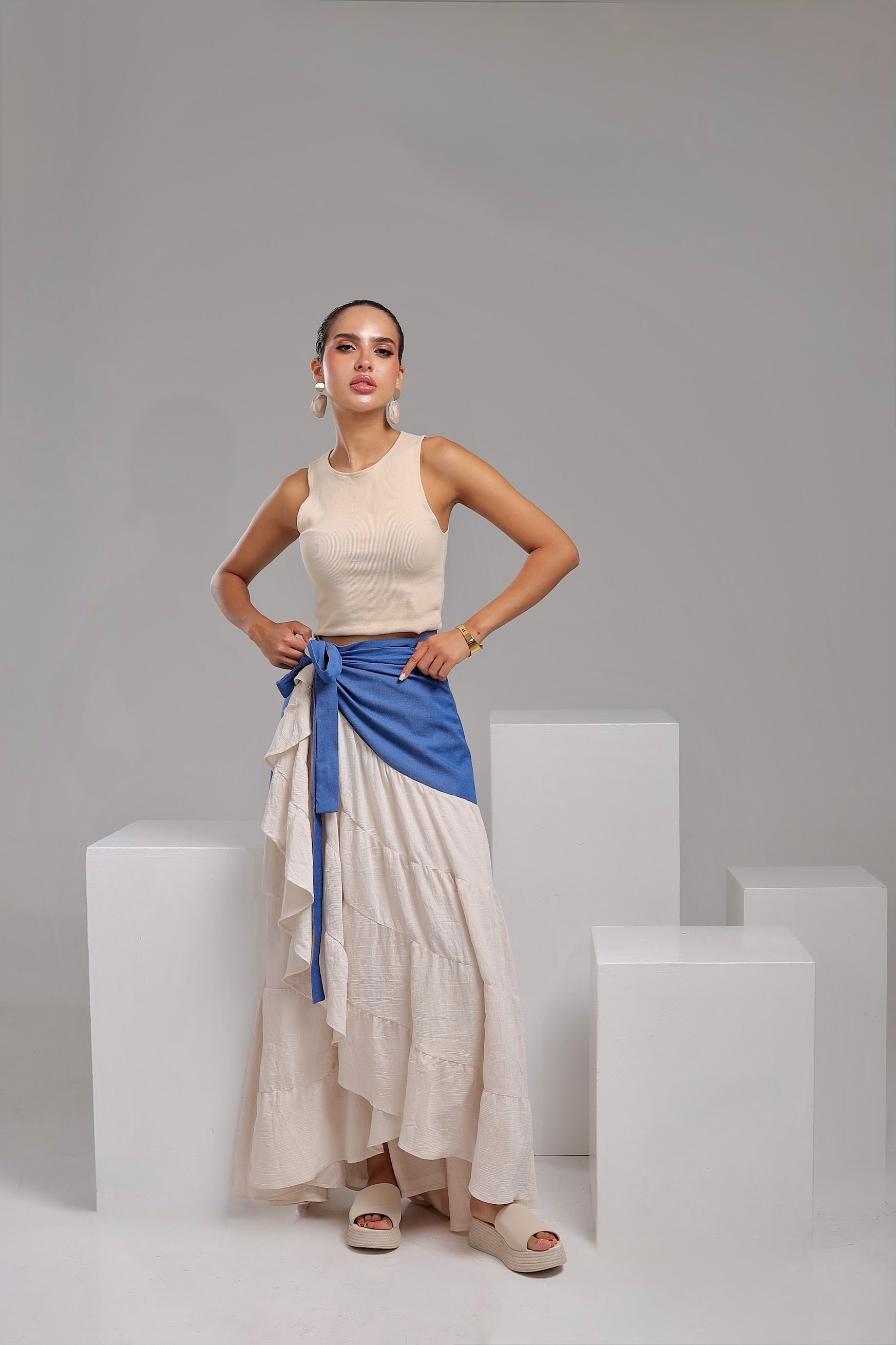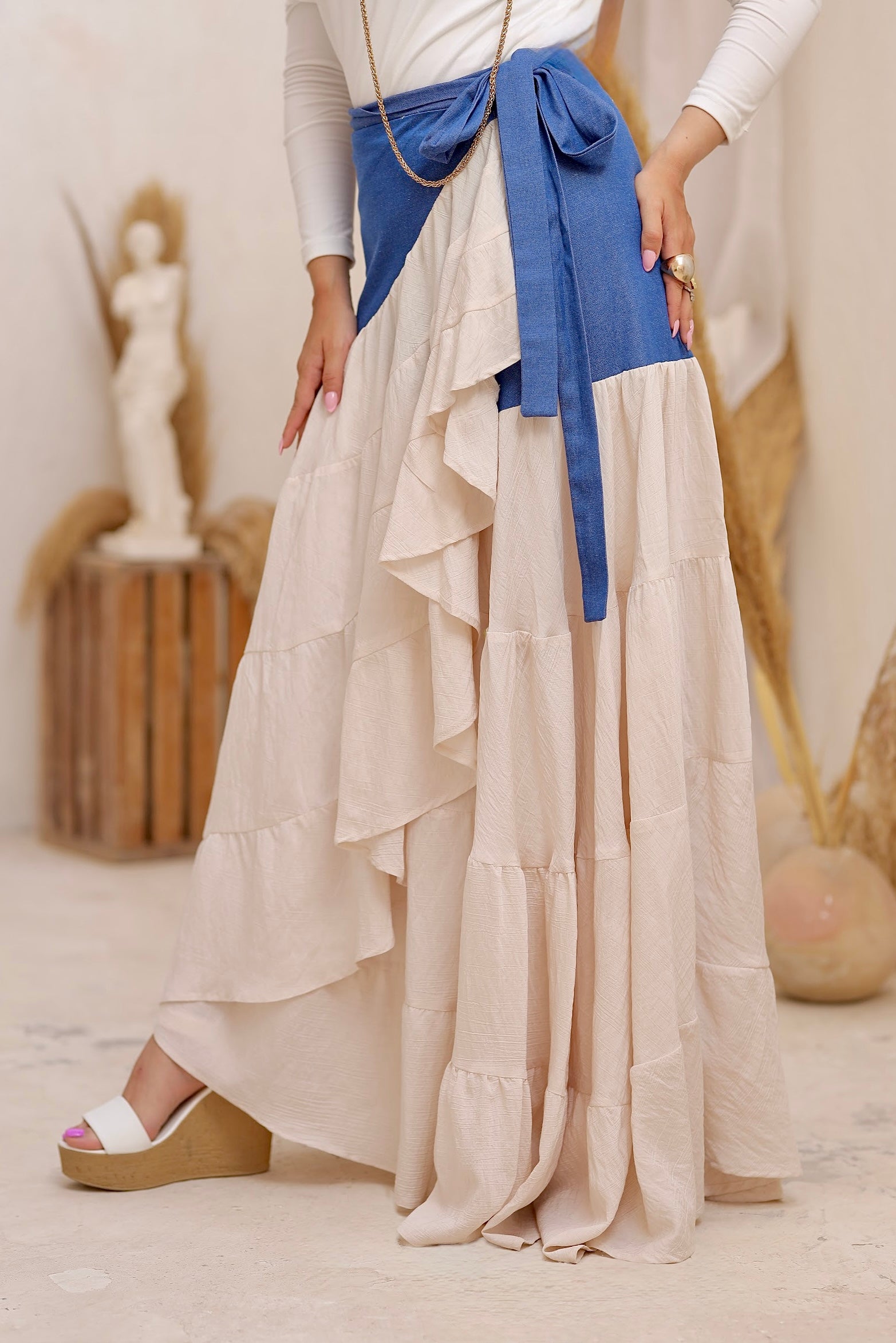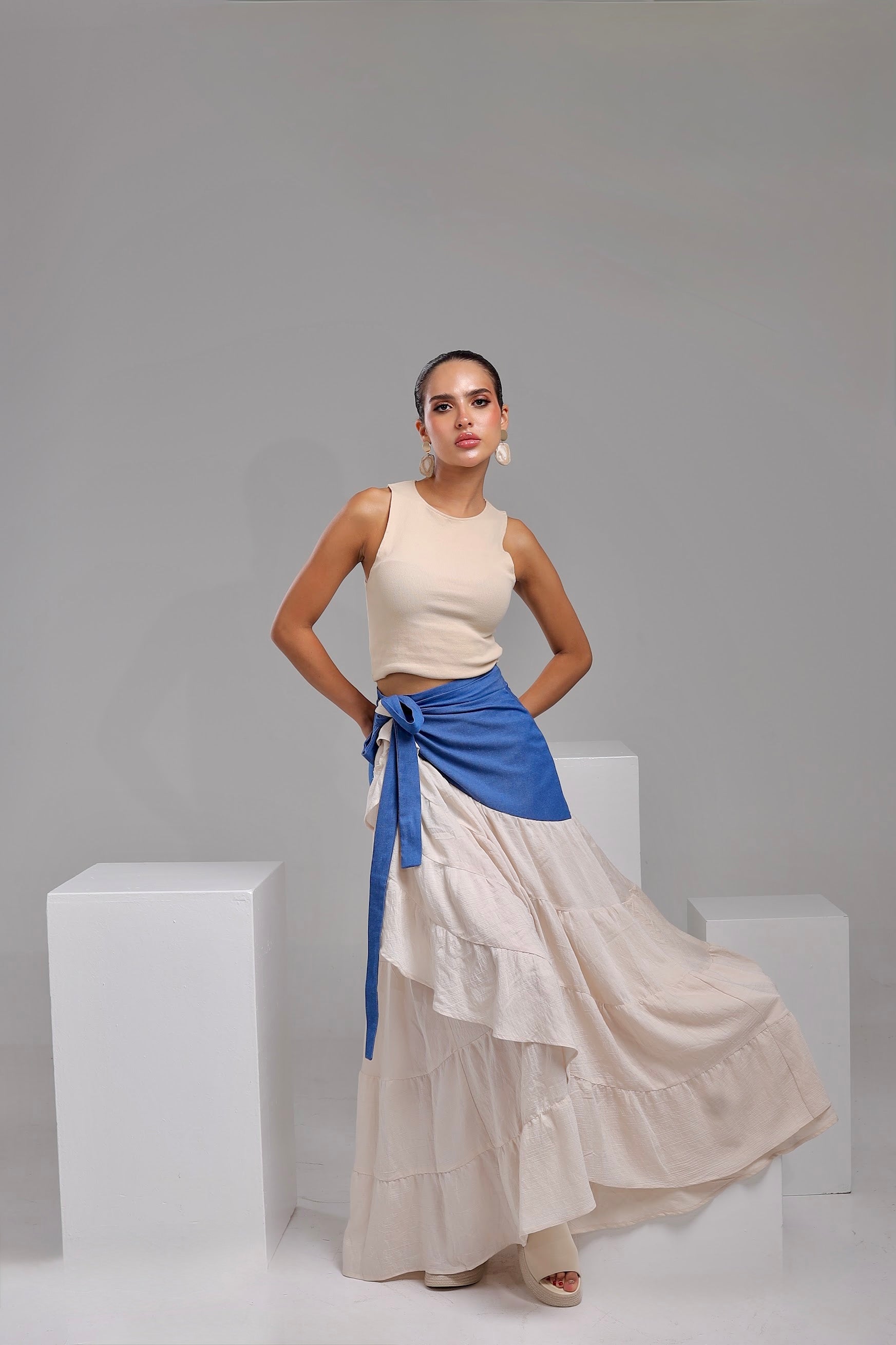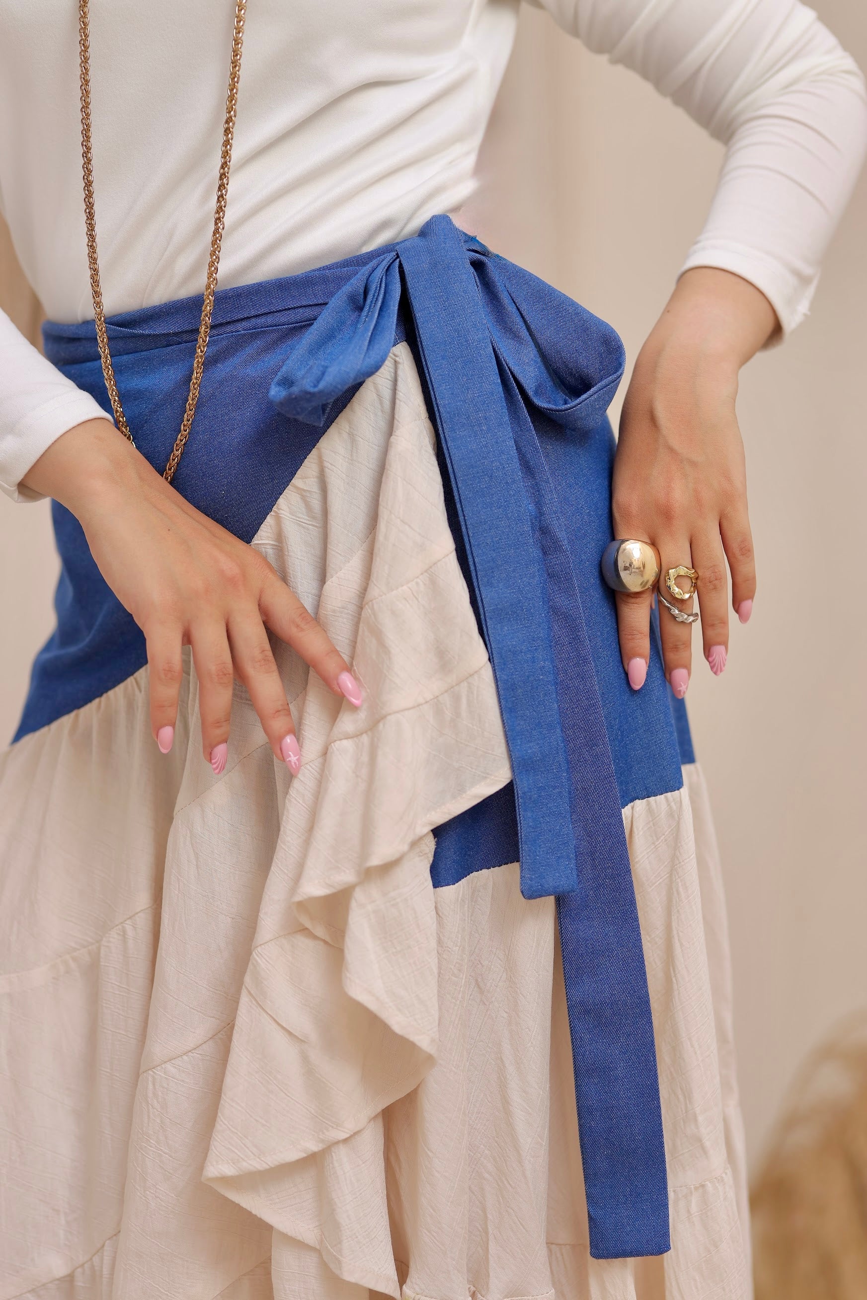 The Modiva Denim Twist Skirt comes in an off-white base with a denim wrap detail for a trendy layered look. Designed as a free-size wrap skirt, it adjusts easily around the waist to suit any body shape. Crafted from lightweight denim blended with soft crepe, it offers comfort, movement, and effortless chic style.