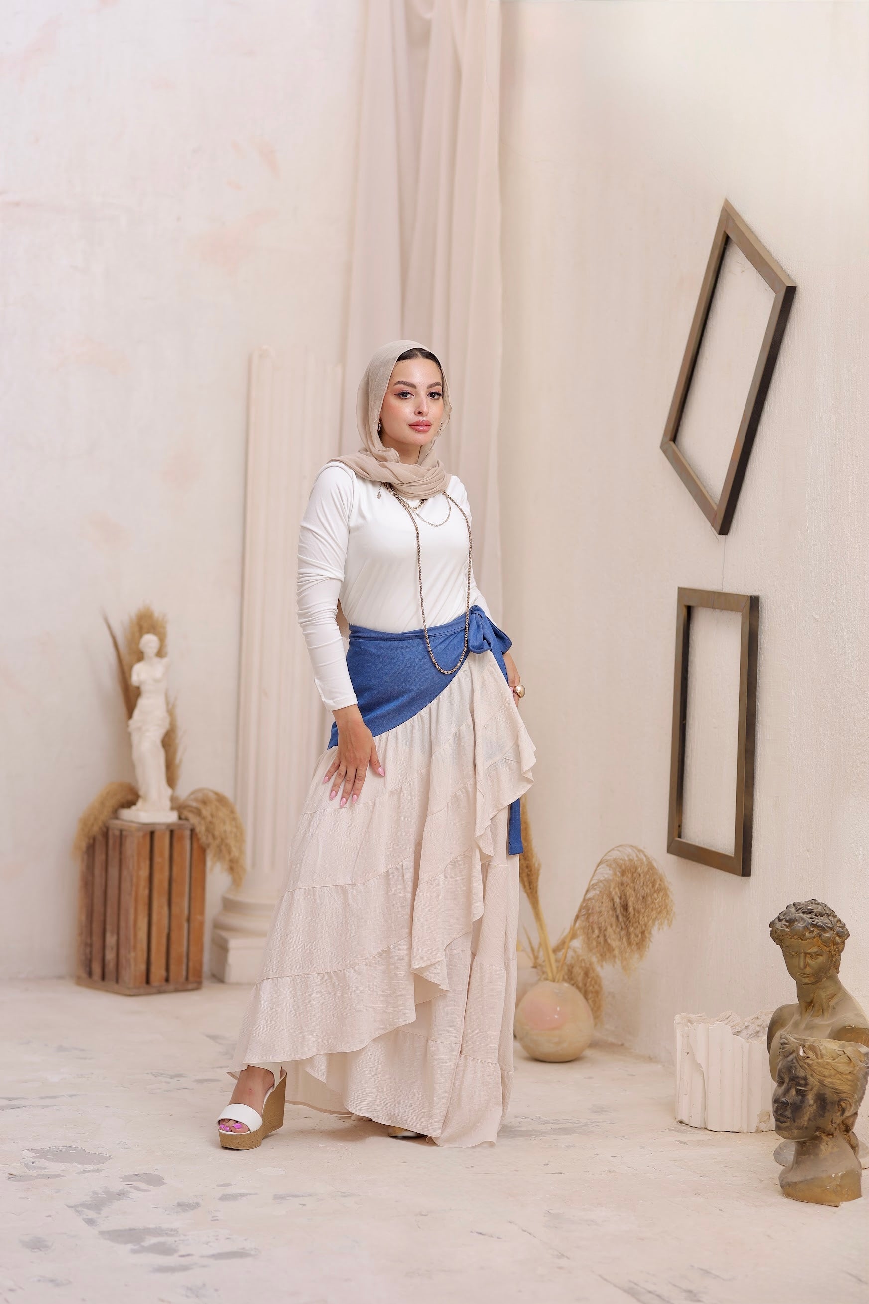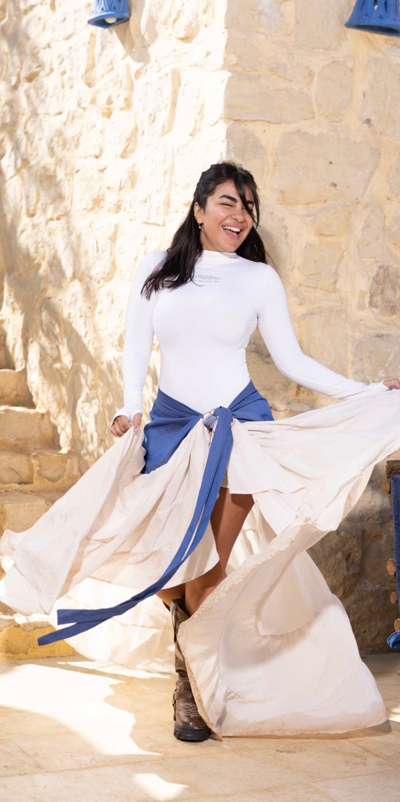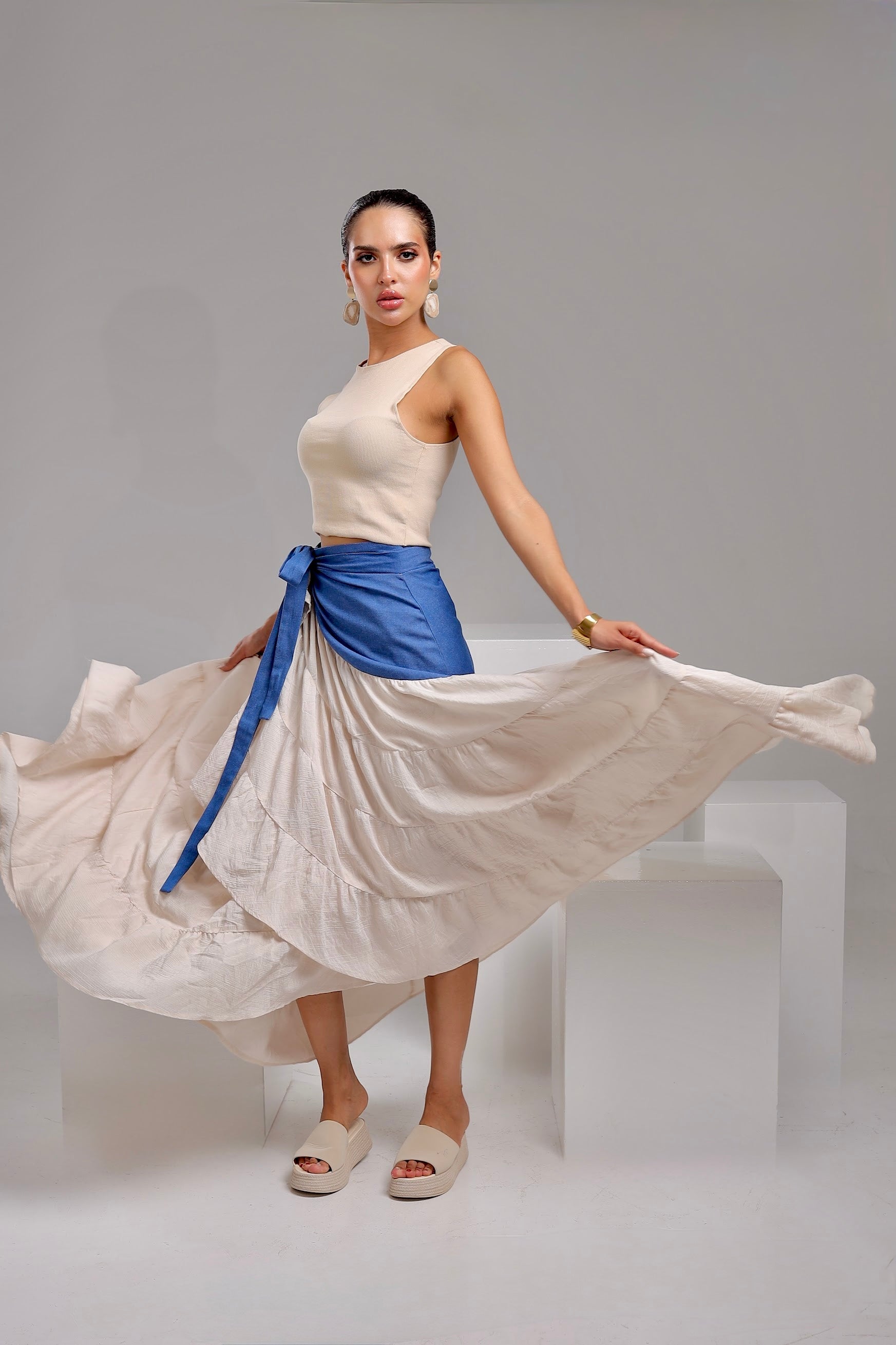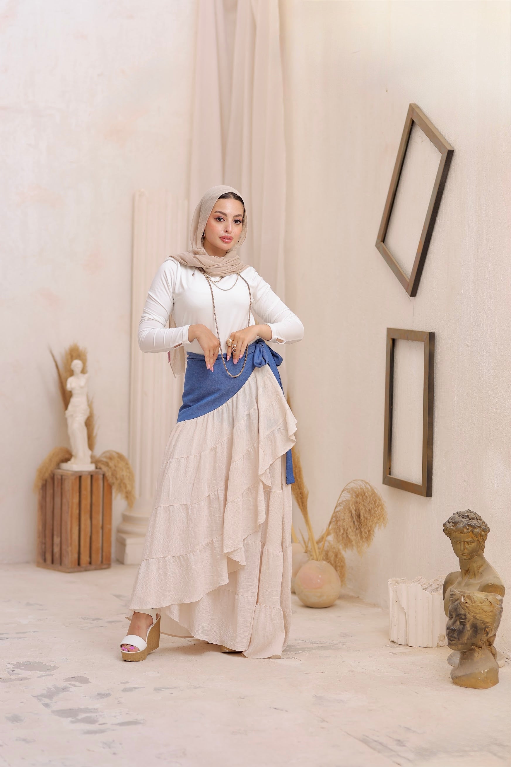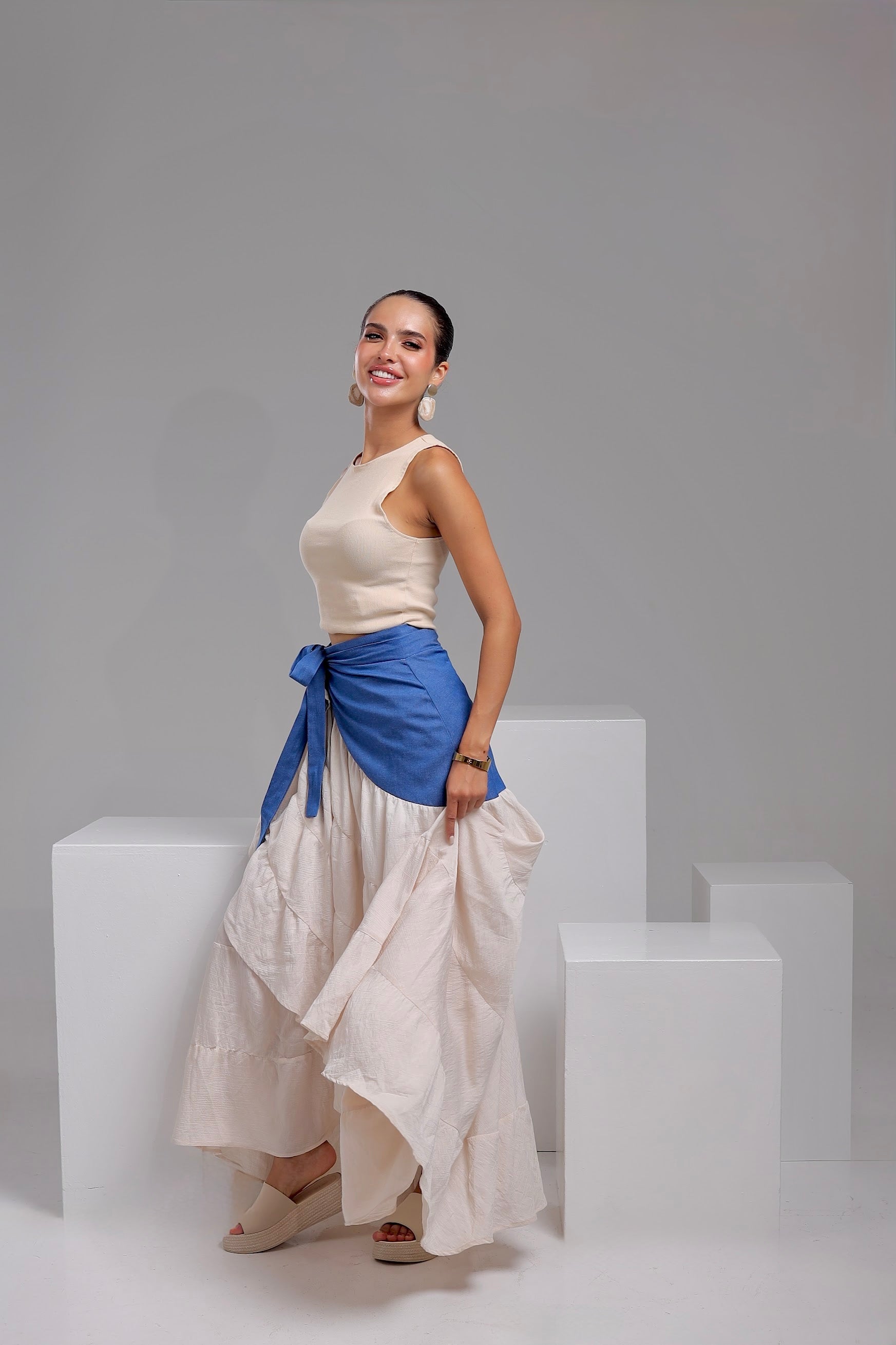 The Modiva Denim Twist Skirt comes in an off-white base with a denim wrap detail for a trendy layered look. Designed as a free-size wrap skirt, it adjusts easily around the waist to suit any body shape. Crafted from lightweight denim blended with soft crepe, it offers comfort, movement, and effortless chic style.